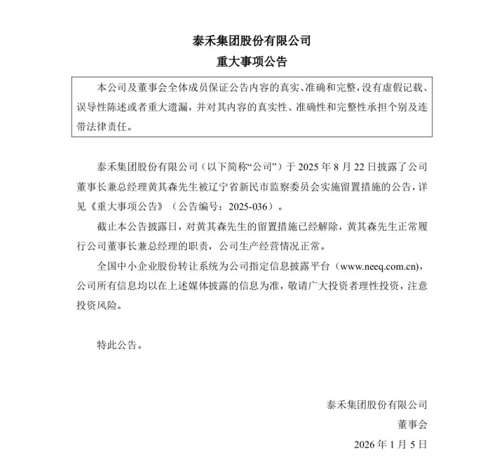去年8月时,泰禾集团曾披露,黄其森因涉嫌违法,被辽宁省新民市监察委员会实施留置措施。彼时,该集团存在的资产被冻结、查封等情况,会对公司运营产生一定影响。除此之外,公司按原组织架构和管理体系正常运转。